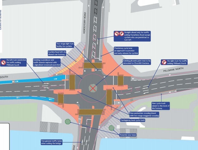 Finally, the changes to the scheme on Lambeth Bridge North (see image above) have weakened cycling and walking provision too. Only one dedicated left turn lane to allow cyclists to avoid waiting at lights remains (two have gone and one more is now shared pavement). On two arms there are now staggered crossings for pedestrians. The bus bypass onto the bridge has also gone, which looks like it removes a potential hook risk that was criticised in the original scheme, but does leave some potential for longer delays for those cycling or potentially even less separation from turning traffic at the lights - we're trying to confirm which currently.
