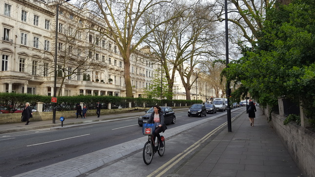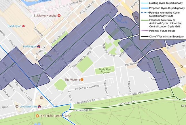 The proposed tracks will link to existing East-West Cycle Superhighway 3 tracks on Westbourne Terrace (below).